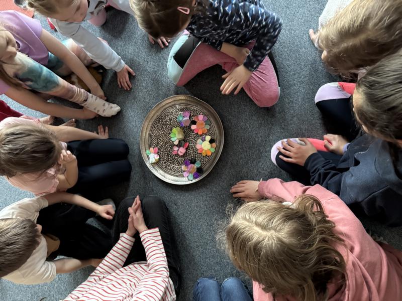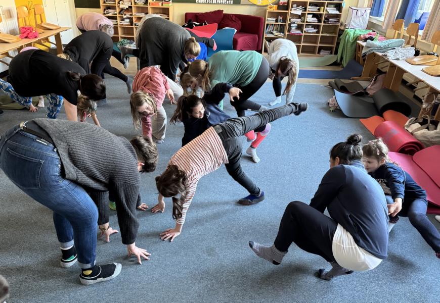 In bequemer Kleidung und mit Yogamatten unter dem Arm trafen sich am 17.2.2025 zehn Familien (jeweils ein Elternteil mit ihren Kindern) zu einem entspannenden Workshop in der Schule. Natalie Sommer, eine ausgebildete Yogalehrerin, hatte ihre Tochter mitgebracht, um die Übungen kindgerecht vormachen zu können. In ansprechendem Wechsel von den aktiven Spielen „Tücherklau“ oder „Begrüßen verschiedener Körperteile“ und Entspannung mit gegenseitiger Massage, autogenem Training mit Atemübungen oder einer Fantasiereise kamen allmählich alle zur Ruhe. Übungen wie das gemeinsame Krokodilatmen führten zu einer starken Verbindung der Familienteams. Bei einer abschließenden Traumreise im Heißluftballon über eine Gedankenwiese konnte das Gelernte gut umgesetzt werden. Es war ein runder Nachmittag, der Eltern und Kindern sehr viel Spaß gemacht hat. Viele Entspannungsübungen werden sicher Einzug in den häuslichen Alltag finden.