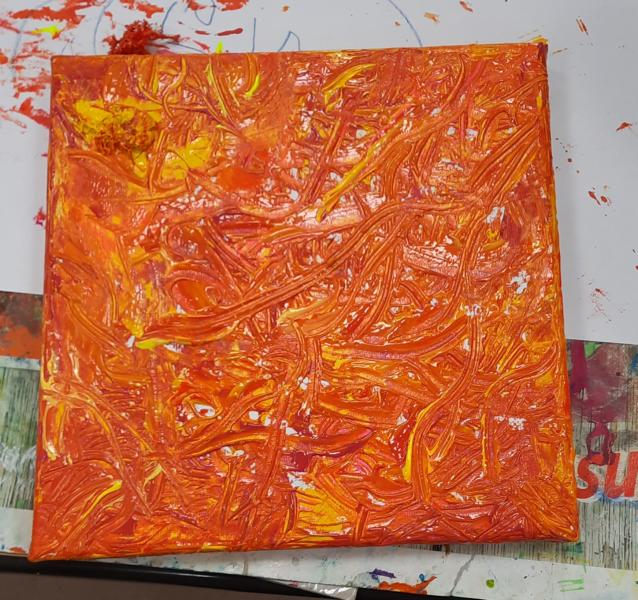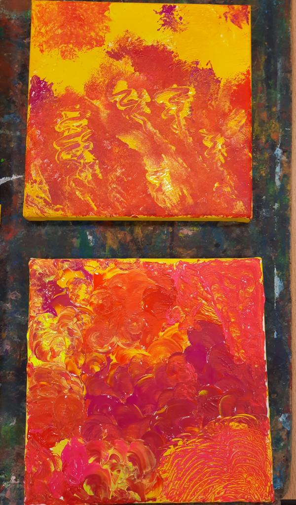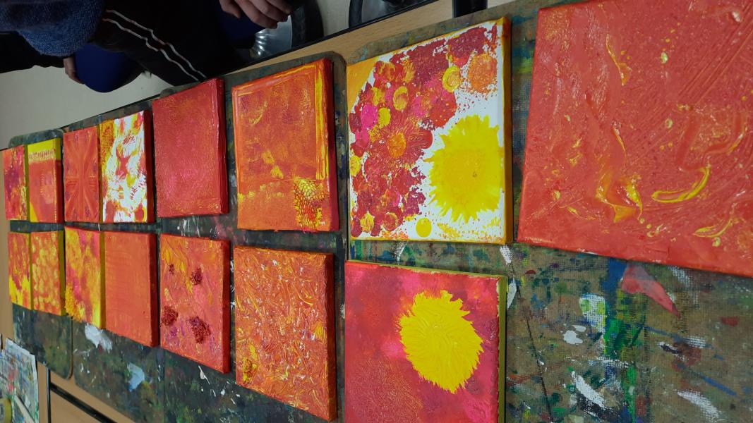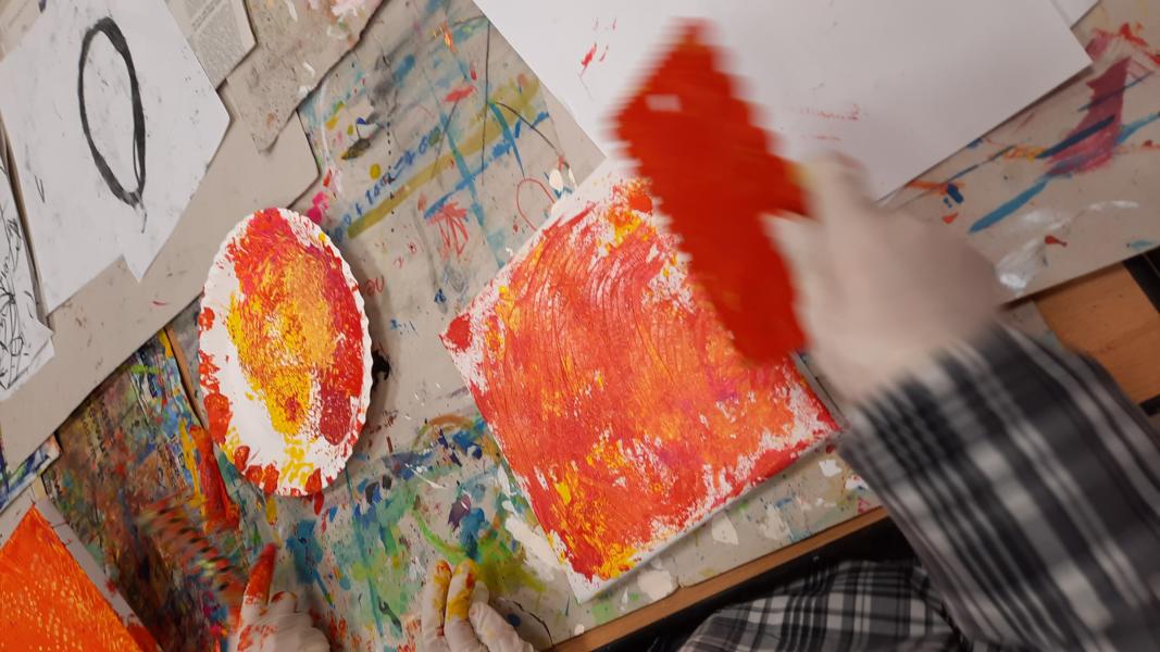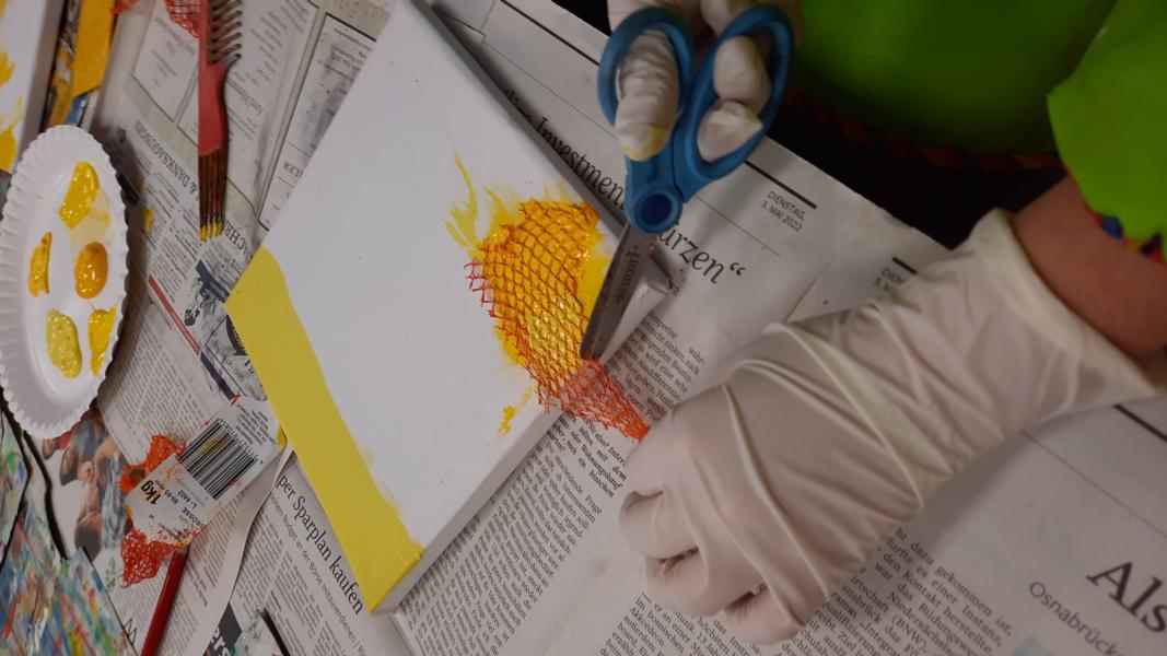 An zwei Terminen im November und Dezember 2023 tauchten viele Schülerinnen und Schüler mit ihren Eltern ein in den „Farbenrausch – malen mal anders“. Unter der Leitung von Frau Dreier wurde auf Leinwänden mit eher ungewöhnlichen Materialien in vielen verschiedenen Gelb- und Rottönen gearbeitet: Mit Zahn-, Spül- und Flaschenbürsten, Schwämmen, Obstnetzen, Kämmen und Bürsten, mit Spachteln und vielem anderen wurde gemalt, getupft, gekratzt, gedruckt… Dabei sind sehr unterschiedliche und kreative Kunstwerke entstanden!