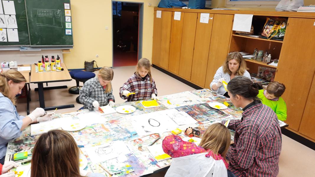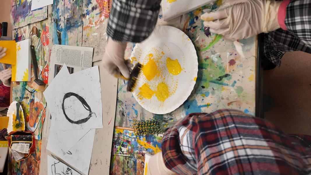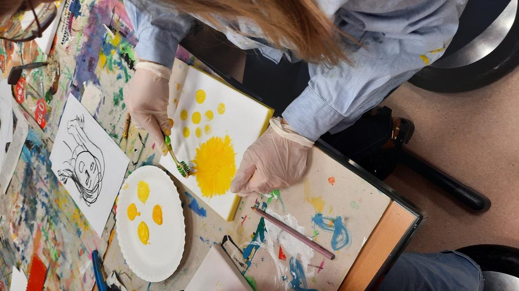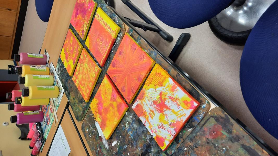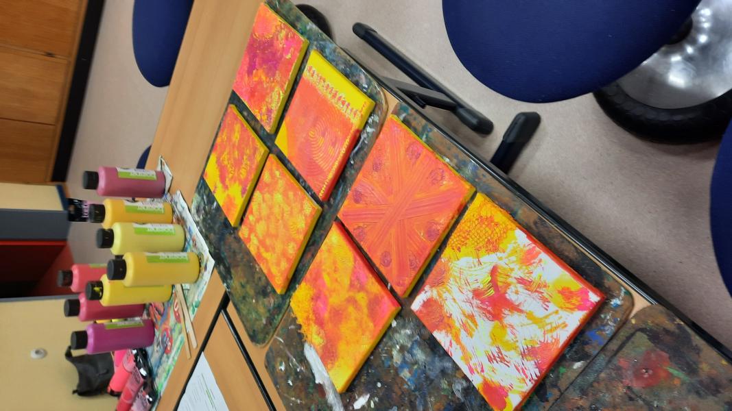 An zwei Terminen im November und Dezember 2023 tauchten viele Schülerinnen und Schüler mit ihren Eltern ein in den „Farbenrausch – malen mal anders“. Unter der Leitung von Frau Dreier wurde auf Leinwänden mit eher ungewöhnlichen Materialien in vielen verschiedenen Gelb- und Rottönen gearbeitet: Mit Zahn-, Spül- und Flaschenbürsten, Schwämmen, Obstnetzen, Kämmen und Bürsten, mit Spachteln und vielem anderen wurde gemalt, getupft, gekratzt, gedruckt… Dabei sind sehr unterschiedliche und kreative Kunstwerke entstanden!