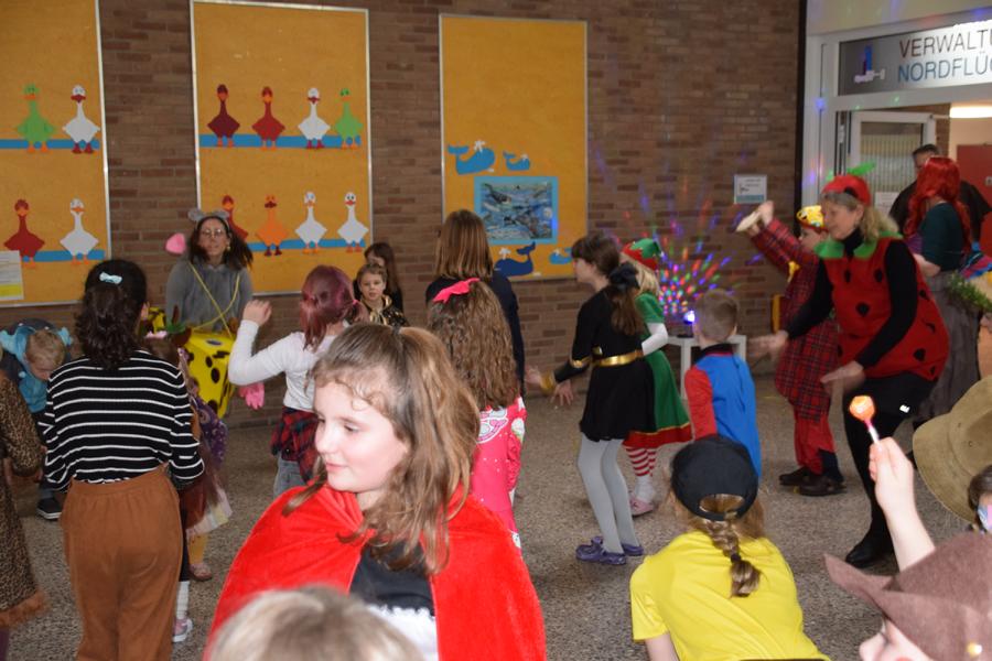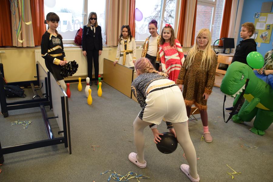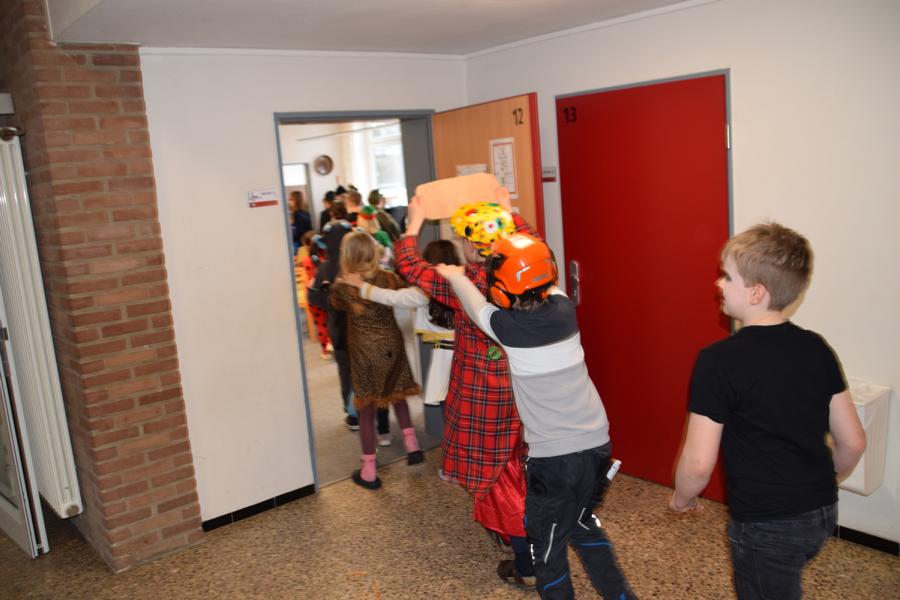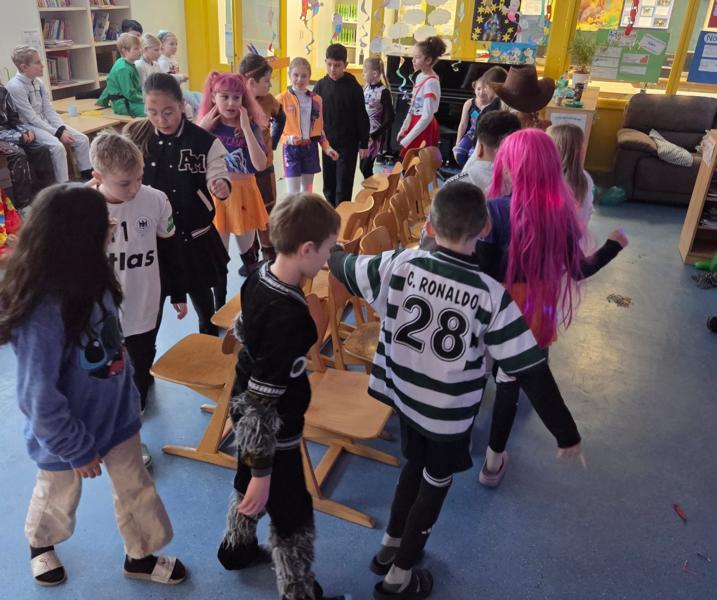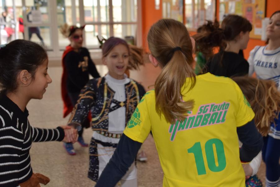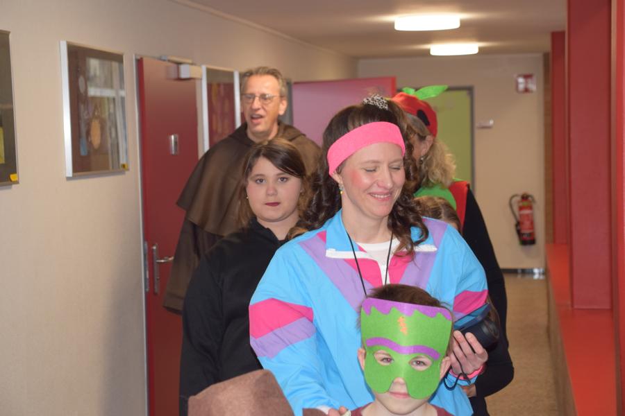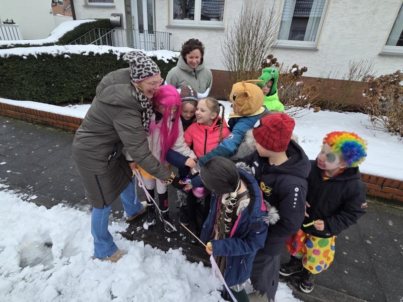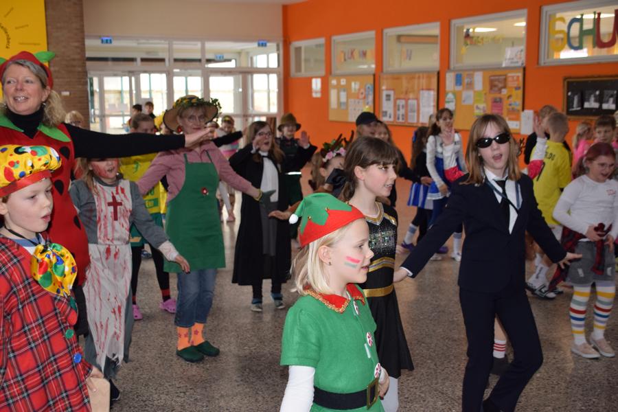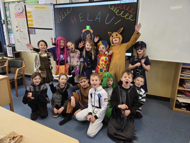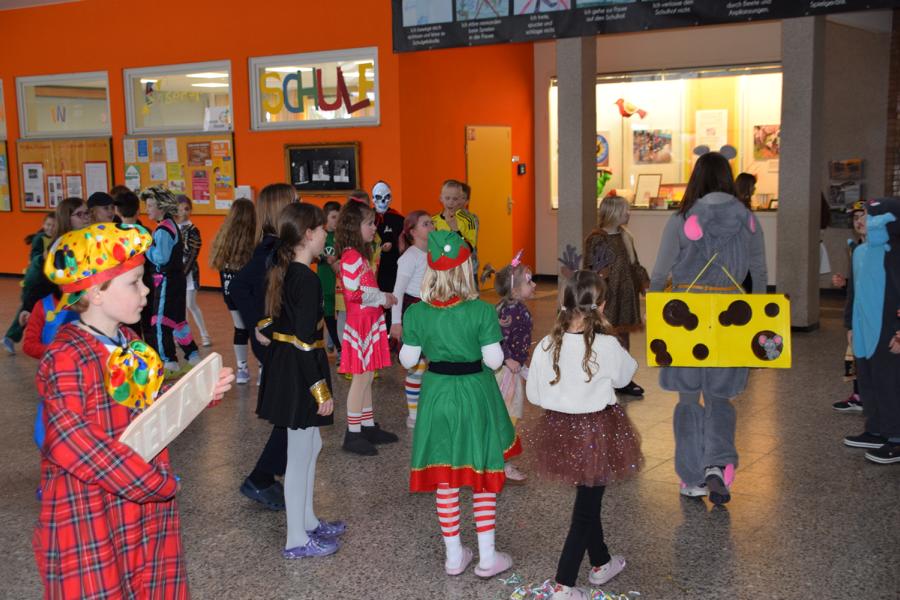 Auch in Natrup-Hagen wurde am Rosenmontag wieder kräftig gefeiert. Ob Prinzessin oder Astronaut, Clown, Cheerleader, Blumentopf oder Polizist - Kinder und Lehrkräfte kamen in wunderbar bunten und vielfältigen Kostümen und brachten gute Feierlaune mit. In den ersten beiden Stunden feierte jede Klasse für sich. Anschließend durften sich alle am vielfältigen und leckeren Buffet stärken, denn jedes Kind hatte etwas mitgebracht. In der dritten Stunde standen alle Klassenräume offen und jedes Kind durfte nach eigenem Interesse an unterschiedlichen Workshops teilnehmen. Insbesondere der Diskoraum war immer sehr gut besucht. In der vierten Stunde durfte der traditionelle Rosenmontagsumzug durch Natrup-Hagen natürlich nicht fehlen. Ausgestattet mit lauten Rasseln, Tröten und einer Musikbox, zogen alle Natrup-Hagener Kinder mit den Lehrkräften durch ihren Ortsteil. Am Straßenrand hatten sich sogar freundliche Fans versammelt (Eltern und Großeltern), die netterweise Süßigkeiten verteilten. Bestens gelaunt ging es wieder zurück in die Schule. Solch einen Schultag hätten die Kinder sicherlich gern häufiger!